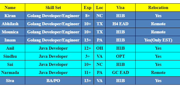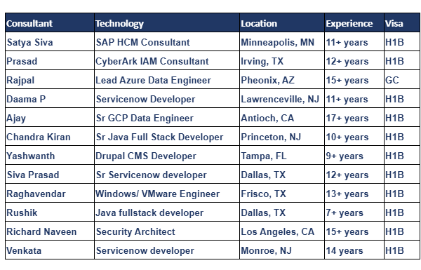 Hi, Greetings of the day, Please find the below Hot-List and share with me your daily C2C requirements to hsheik@codewaveit.com or you can reach on +1 (717) …