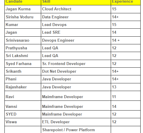 C2C HOTLIST Hello Connections, We have some excellent profiles available on our bench, Candiate Skill Experience Jagan Kurma Cloud Architect 15 Sirisha Voduru Data Engineer …