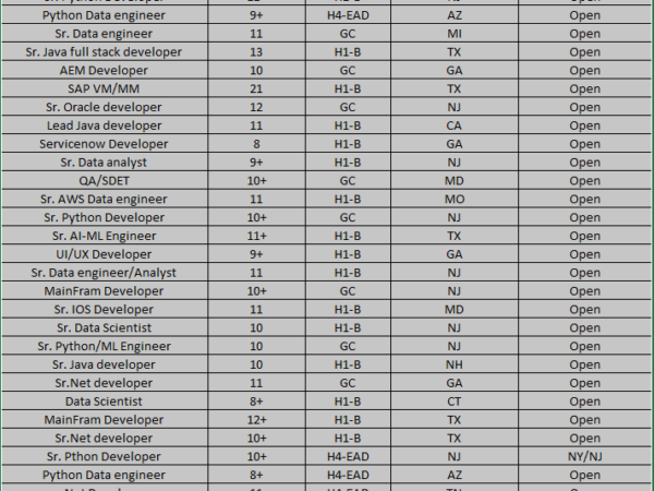 Hi Recruiters, Greetings from CaritaTech! We have strong consultants available for immediate submission: Ready for immediate interviews Open for C2C roles Strong technical & communication …