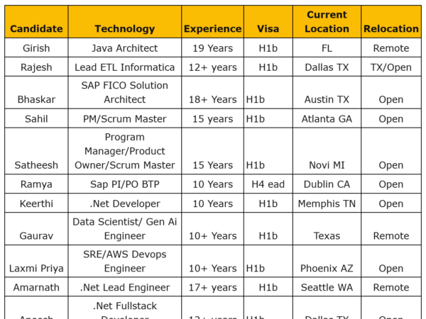 TECHNOLOGY EXP LOCATION ONSITE/REMOTE Senior BI Lead Architect 15+ WA Remote Lead ETL Developer 14+ FL EST// Remote Power platform Developer/Sharepoint 11+ Charlotte,NC Remote Full …