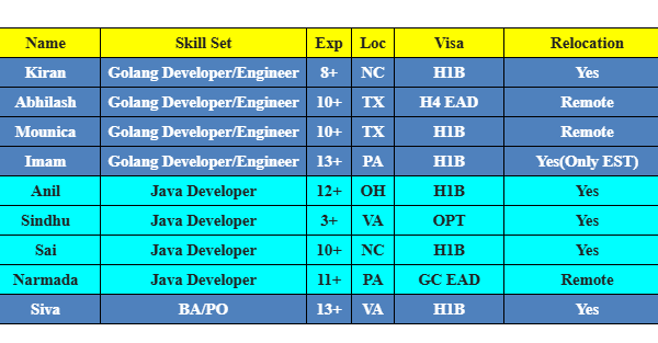 Hi, Greetings of the day, Please find the below Hot-List and share with me your daily C2C requirements to hsheik@codewaveit.com or you can reach on +1 …