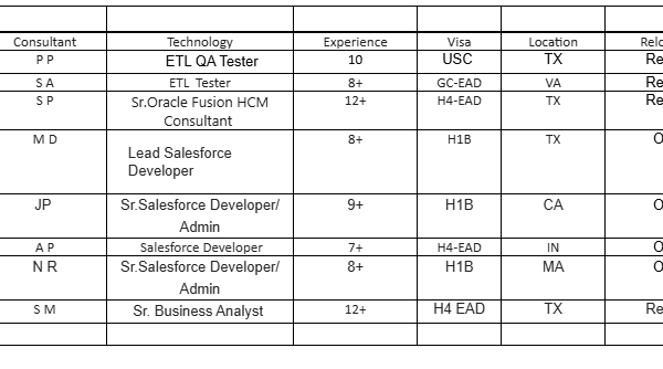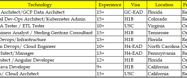 Hi , Hope you are doing good, Here is my list of consultants available for new C2C projects, let me know if you have any open requirements for them. S.No Consultant Technology Experience Visa …